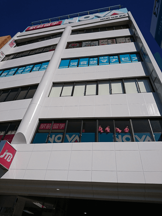 1階に「JTB」さんが入っていて、ビルの上には「NOVA」さんの看板があります。徒歩約1分です。