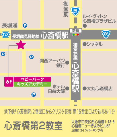 大阪メトロ長堀鶴見緑地線:心斎橋駅、2番出口からクリスタ長堀を通り、南15番出口を出て、右手後方すぐのところに見える建物「心斎橋ニューきよみビル」6階に教室がございます。
