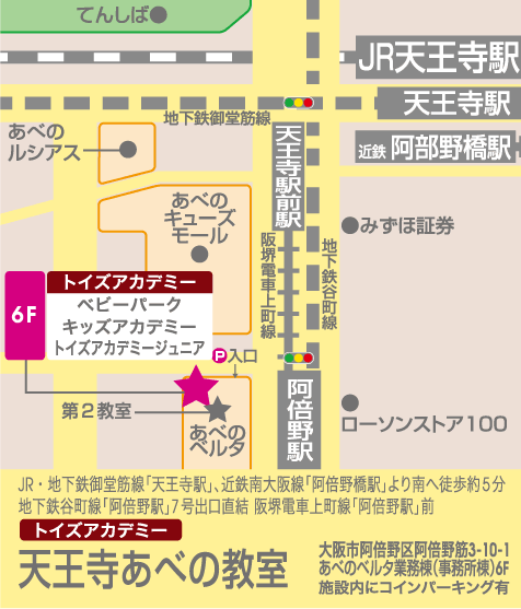 地下鉄谷町線阿倍野駅 7号出口直結 JR・地下鉄御堂筋線 天王寺駅、近鉄南大阪線 阿部野橋駅 南へ徒歩5分 阪堺電車上町線 阿倍野駅前 |