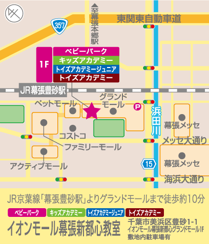 電車でお越しの方 JR京葉線「幕張豊砂駅」より グランドモールまで徒歩約10分 車でお越しの方 敷地内に駐車場がございます |
