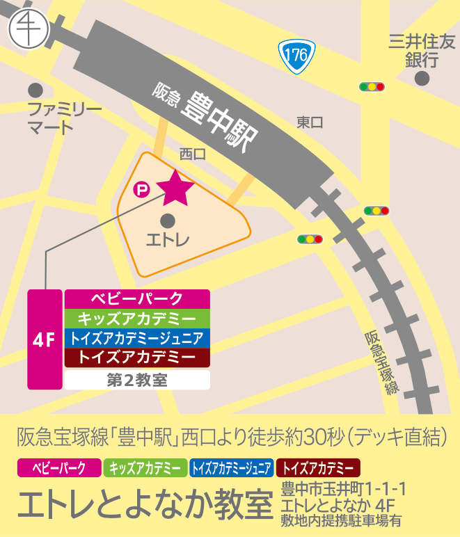 阪急宝塚線:豊中駅直結、西口目の前、「エトレとよなか」の4階に教室がございます。徒歩約30秒です。