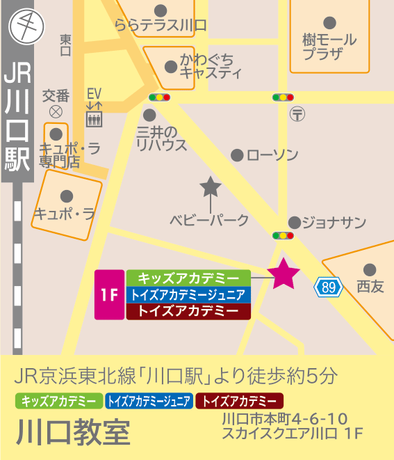 JR京浜東北線 川口駅東口から徒歩約5分 川口駅には「ベビーパーク川口教室」(第一ビル)と「トイズアカデミージュニア川口教室」(スカイスクエア川口レジデンス)がございます。 ベビーパークのレッスンは「ベビーパーク川口教室」(第一ビル)にて行っております。 それ以外のキッズアカデミー、トイズアカデミージュニア、トイズアカデミーのレッスンはどちらの教室でも行っております。 体験レッスンのご予約先をご確認の上、お間違いのないようにお越しください。 |