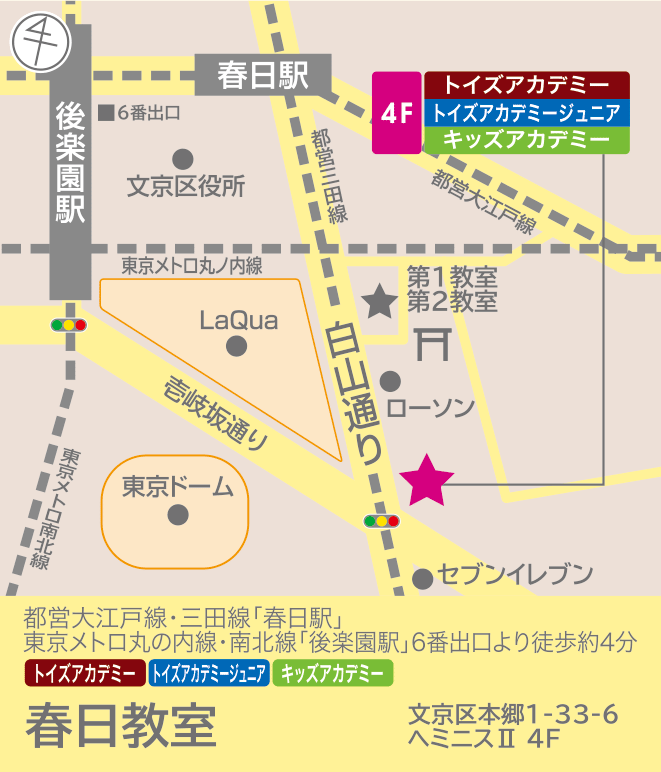 電車でお越しの方 都営大江戸線・都営三田線「春日駅」 東京メトロ丸ノ内線・南北線「後楽園駅」6番出口より徒歩約4分 車でお越しの方 専用駐車場はありませんので、近隣の駐車場をご利用ください ※トイズアカデミーの教室で、レッスンをしています※ |