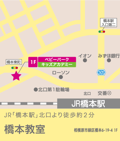 教室があるのは橋本駅の北口です。駅にはエレベーターも完備されており、教室は1階にあるため、ベビーカーでもご通室していただきやすい環境です。