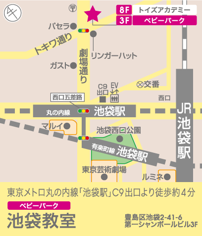 電車でお越しの方 東京メトロ丸の内線:池袋駅、C9出口を出たら「三井住友銀行」さんが入るビルの方へ信号を渡ります。 右手に「三井住友銀行」さん、左手に「セブンイレブン」さんを見ながら直進。 横断歩道を2つ、信号を1つ渡った先、角から2軒目の「第一シャンボールビル」の3階に教室が入っています。徒歩約4分です。 車でお越しの方 専用駐車場はございませんので、近隣のコインパーキングをご利用ください。 【ベビーカーでお越しの場合】 3階エレベーターホールと教室玄関に、ベビーカーを畳まずにご利用いただけます。 |