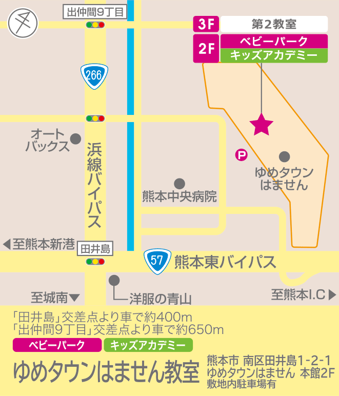 「田井島」交差点より約400m、「出仲間9丁目」交差点より約650mのところにある「ゆめタウンはません本館」の2階に教室がございます。
