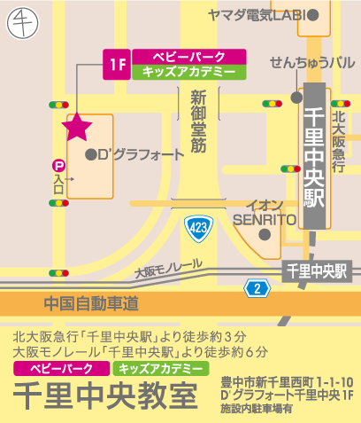 | 電車でお越しの方 北大阪急行電鉄 千里中央駅より徒歩5分 大阪モノレール線 千里中央駅より徒歩7分 地下鉄千里中央駅南出口をエスカレーターで上がってすぐ、モノレール千里中央駅出口より北(そのまま真っ直ぐ)、150Mフライドチキン店「OLIVE CHICKEN」横の歩道橋よりお越しください。 車でお越しの方 施設内に駐車場がございます ※一部負担あり ※キッズアカデミーの体験レッスンはトイズアカデミー千里中央教室でも行っておりますので、お越しの際は、体験教室のご確認をお願い致します。 トイズアカデミー千里中央教室(キッズアカデミークラス) 〒562-0036 大阪府箕面市船場西1-6-7 三羽鶴ビル 5F |