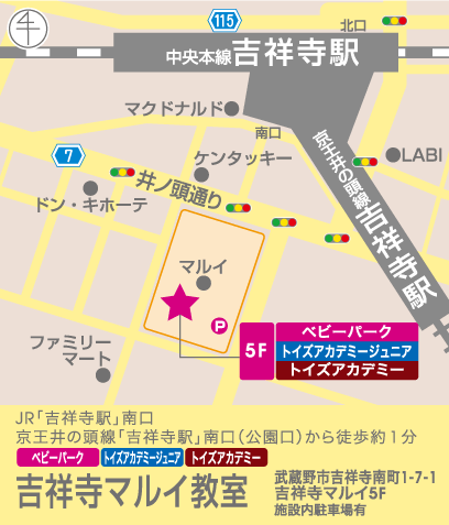 電車でお越しの方 JR中央線・総武線・京王井の頭線:吉祥寺駅の南口(公園口)を出たらすぐ目の前の路地路をまっすぐ進み、井之頭通りに出ます。 交差点、右手前方に見える建物「吉祥寺マルイ店」5階に教室が入っています。徒歩約1分です。 車でお越しの方 吉祥寺マルイ店の駐車場をご利用ください。2時間の補助がございます。 【自転車でお越しの場合】 専用駐輪場はございません。 ・吉祥寺南口第1駐輪場(オリジナルパンケーキさん側外周) ・吉祥寺南口第2駐輪場(ドン・キホーテさん裏) 上記駐輪場が最初の2時間が無料、以降2時間毎に100円でお使いいただけます。 【ベビーカーでお越しの場合】 ベビーカー置き場所は教室内です。扉の外にはベビーカーなど物を置かないようにしてください。 ★重要★ 10:10~のレッスンへご参加の方へご案内: 吉祥寺マルイの開店が10:30からの為、入店場所が正面玄関に限られます。 10時に正面玄関の扉が半分だけ開くので、道なりに進みエレベータで5階へ降りたらすぐに教室です。 (エスカレータは動いていません) |