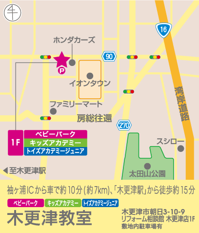 JR線:木更津駅から車で東に8分のところにある「リフォーム相談館 木更津店」さんが入る建物の1階に教室が入っております。